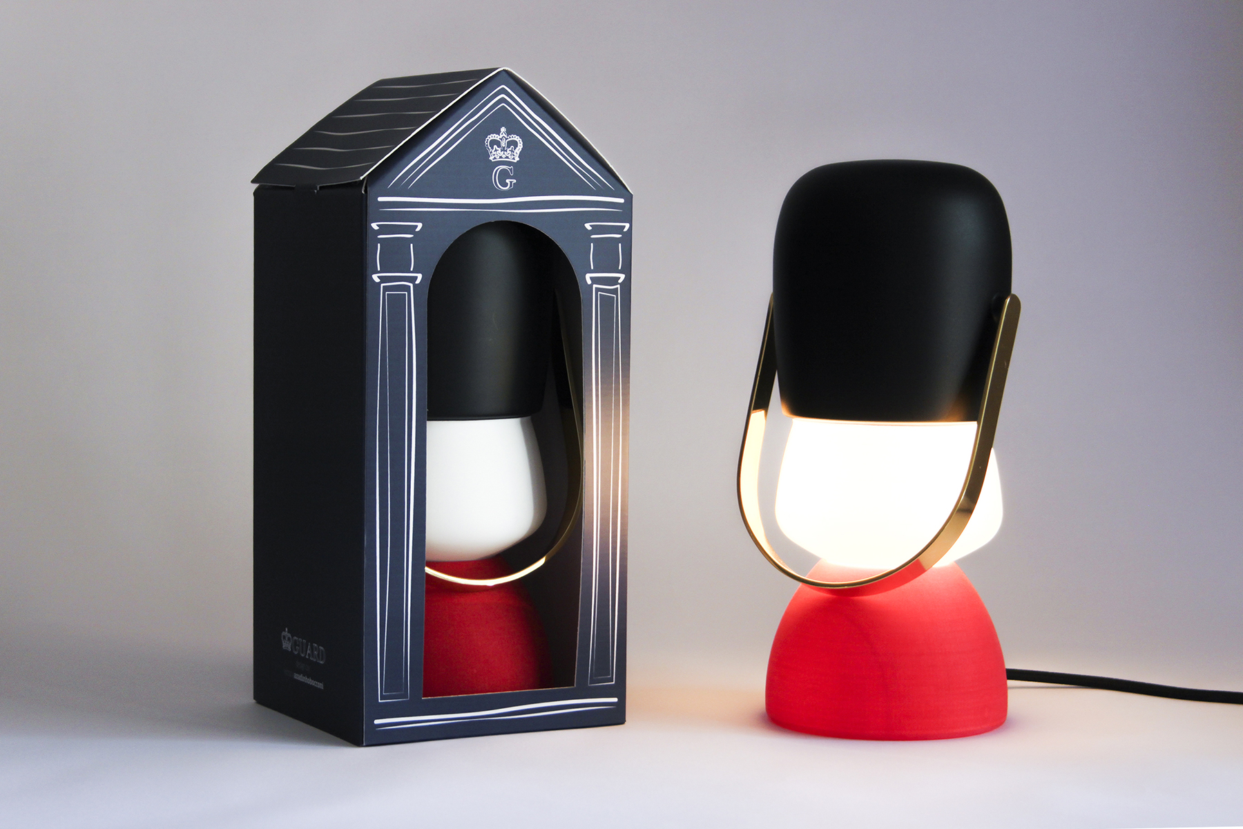 Inspired by one of its symbols – the Queen’s Guards at Buckingham Palace – Guard is a table lamp that, thanks to an internal battery, you can use it as a lantern. If you want to move it, you can grab the chin strap and use it as an handle.
